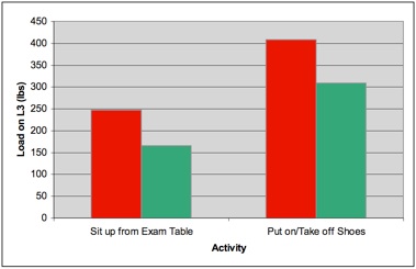 •Evaluate your patient for excessive spine load. Watch your patient move while in the exam room. Spine loads are elevated during exam room activities such sitting up from an exam table or removing shoes.